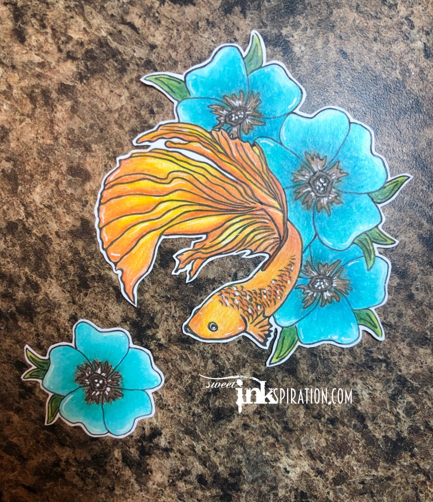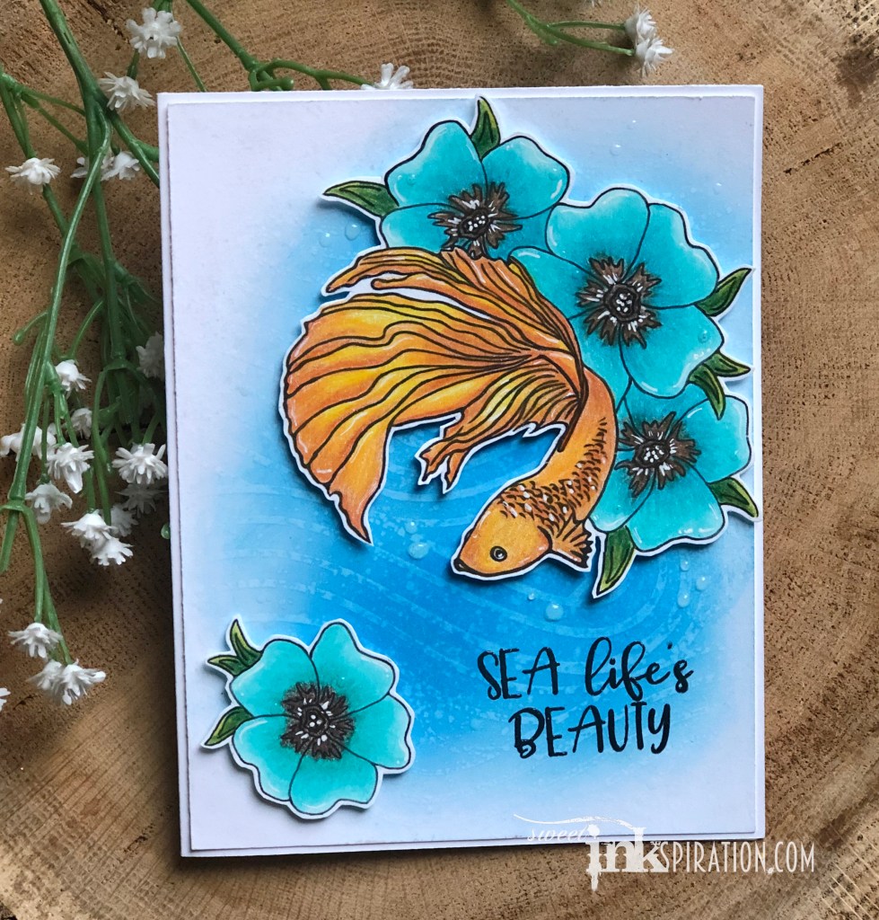Since the images were already colored and cut, the rest of the card came together pretty quickly. I used Salty Ocean Distress Oxide with my favorite blending brushes from Picket Fence Studios. I sprayed water on a Vicki Boutin waves stencil from the Wander collection and pressed it down. The sentiment is from Colorado Craft Company’s “Be a Mermaid” set. It is embossed but it is hard to tell in the photo. I used a white pen for highlights. Donna gave me the idea to add shimmer to the fish so I covered it in clear Wink of Stella. The last thing I did after placing the images was use Stampin’ Up Fine Tip Glue to make water droplets.