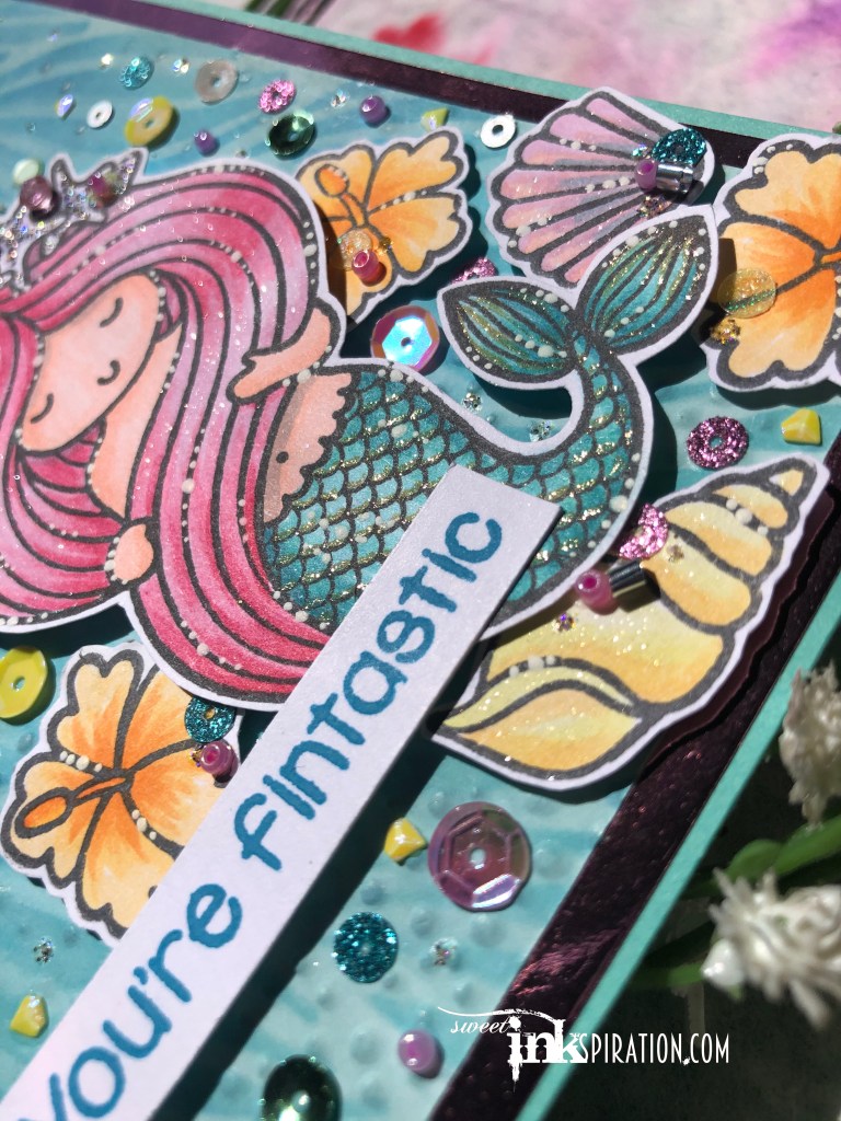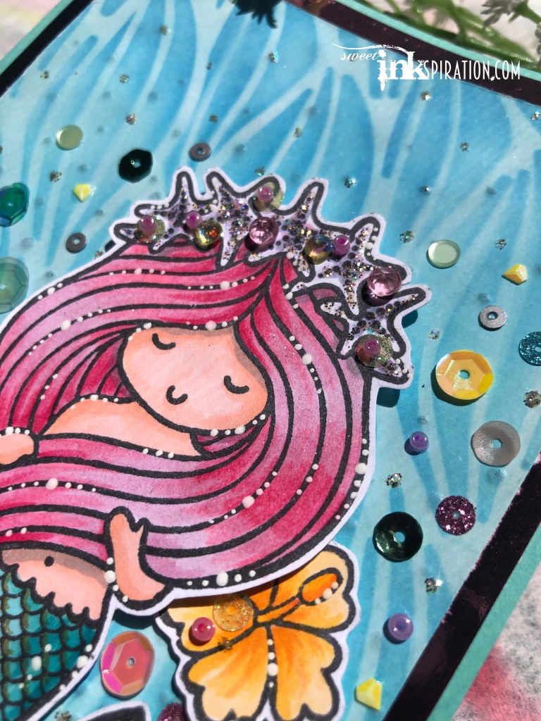 Once the coloring and highlighting were finished, the real fun began. It was time for bling! Of course I went right to my case of Sparkle Blends from Doodles Paper Playground. I really wanted this card to have an ethereal underwater feel. I chose “Springtime” because there were so many different elements in this blend and I knew the versatility of it would work. Every single sequin and gem on this card came from that one blend. “Springtime” is on low inventory so grab it before it runs out!
