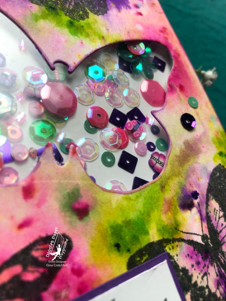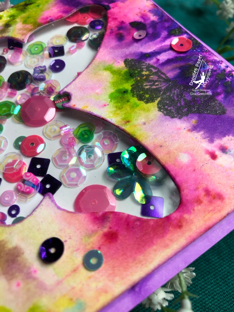 So, for my first act I present “Flutter By Butterfly.” This blend fueled all the decision making in this card from color theme, shaker shape to which medium to use for the background. I wanted to create movement, or a flutter of butterflies, like the name suggests.