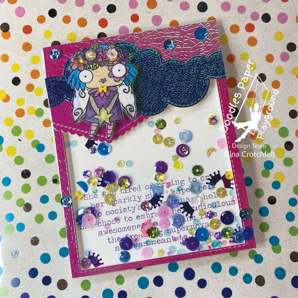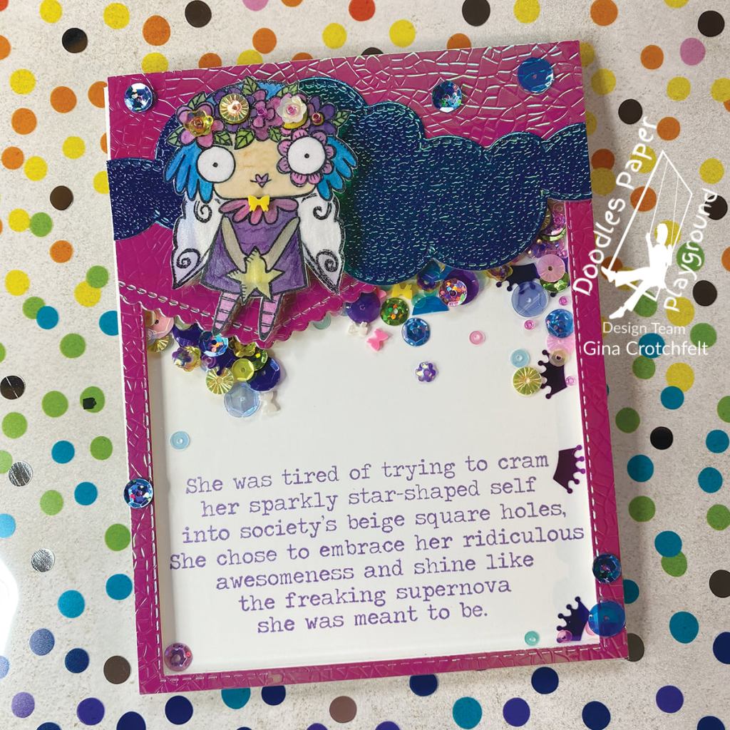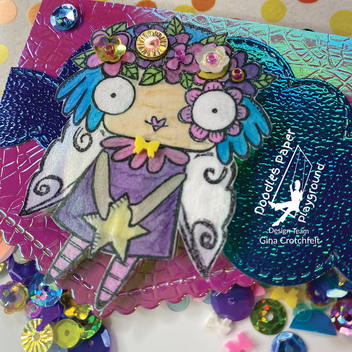 One of my favorite parts of this card is the sentiment, which I felt paired so well with the imagery and elements in the Sparkle Blend. I stamped the sentiment in purple Opalescent ink. For the final touch, I pulled different elements from the blend to glue around the edges and adorn her crown. I even added a bow at her neck. For this and all the other exclusive Limited edition Sparkle Blends, check out the Sparkle Blends Shop from Doodles Paper Playground.