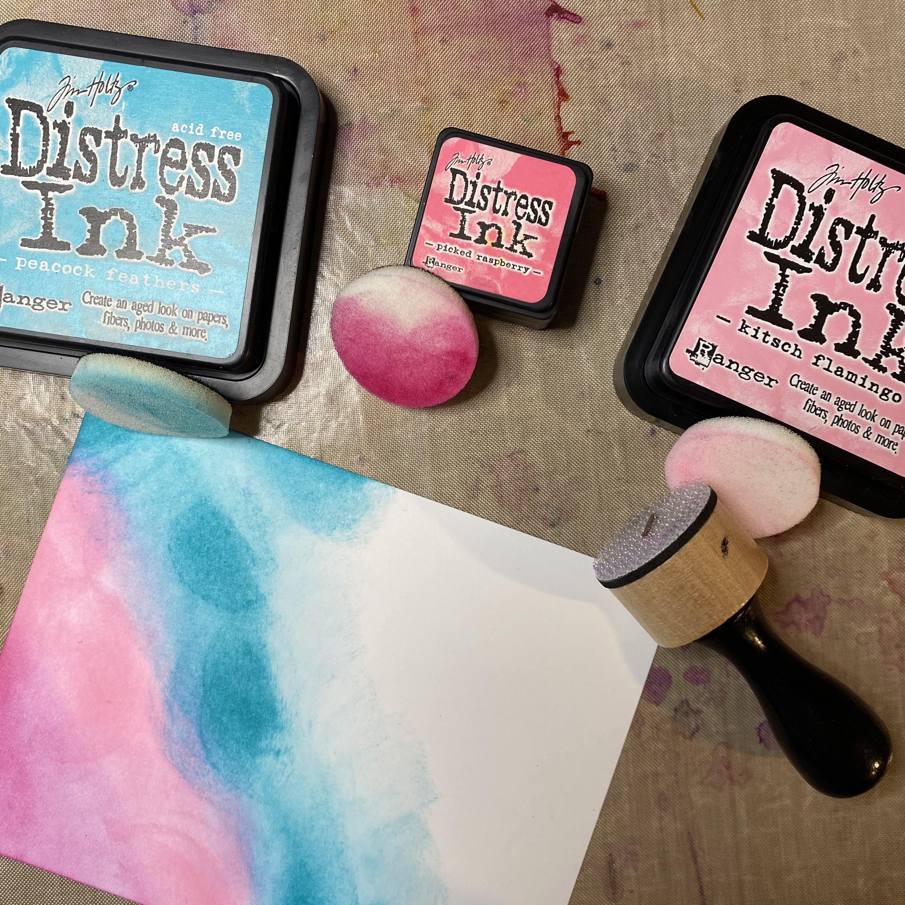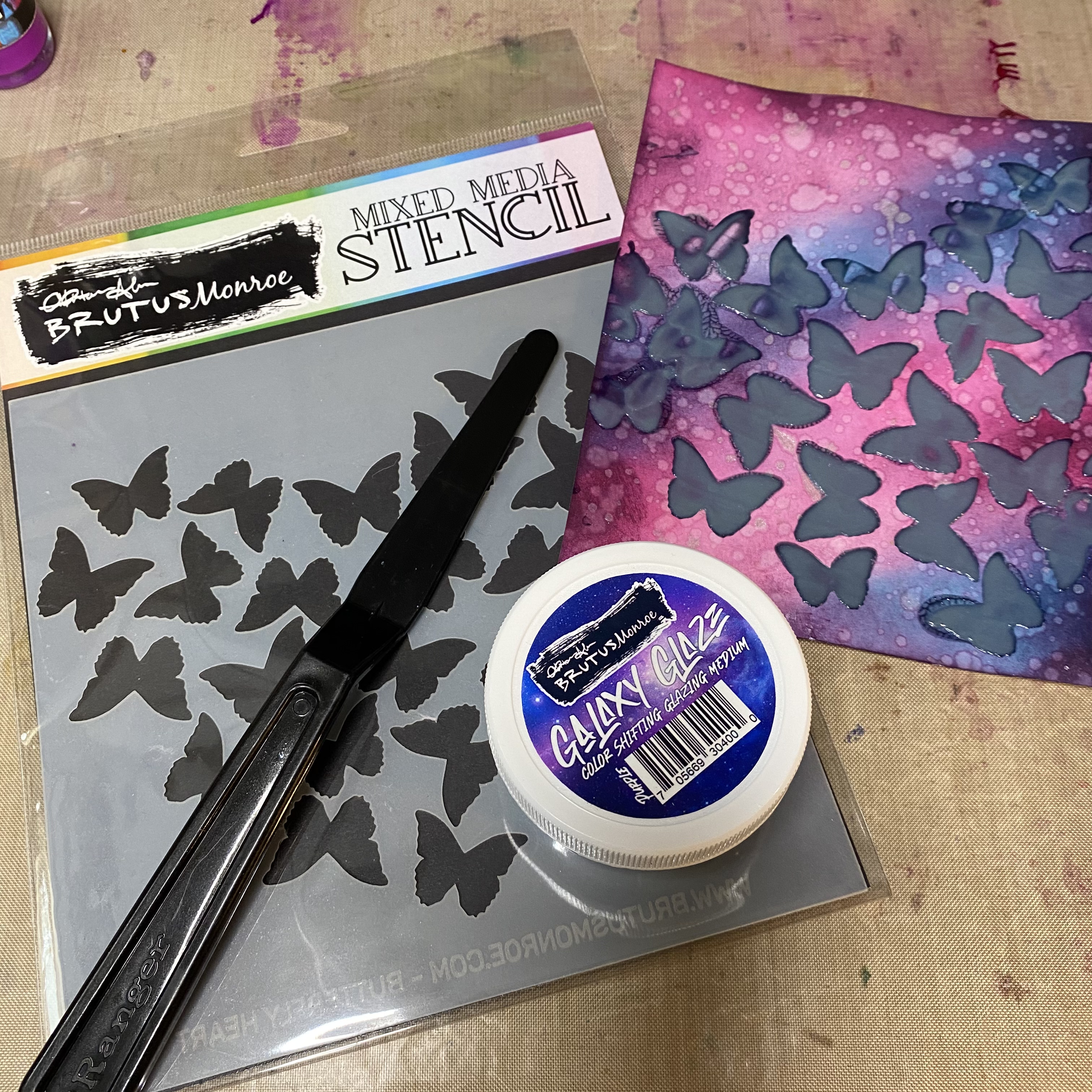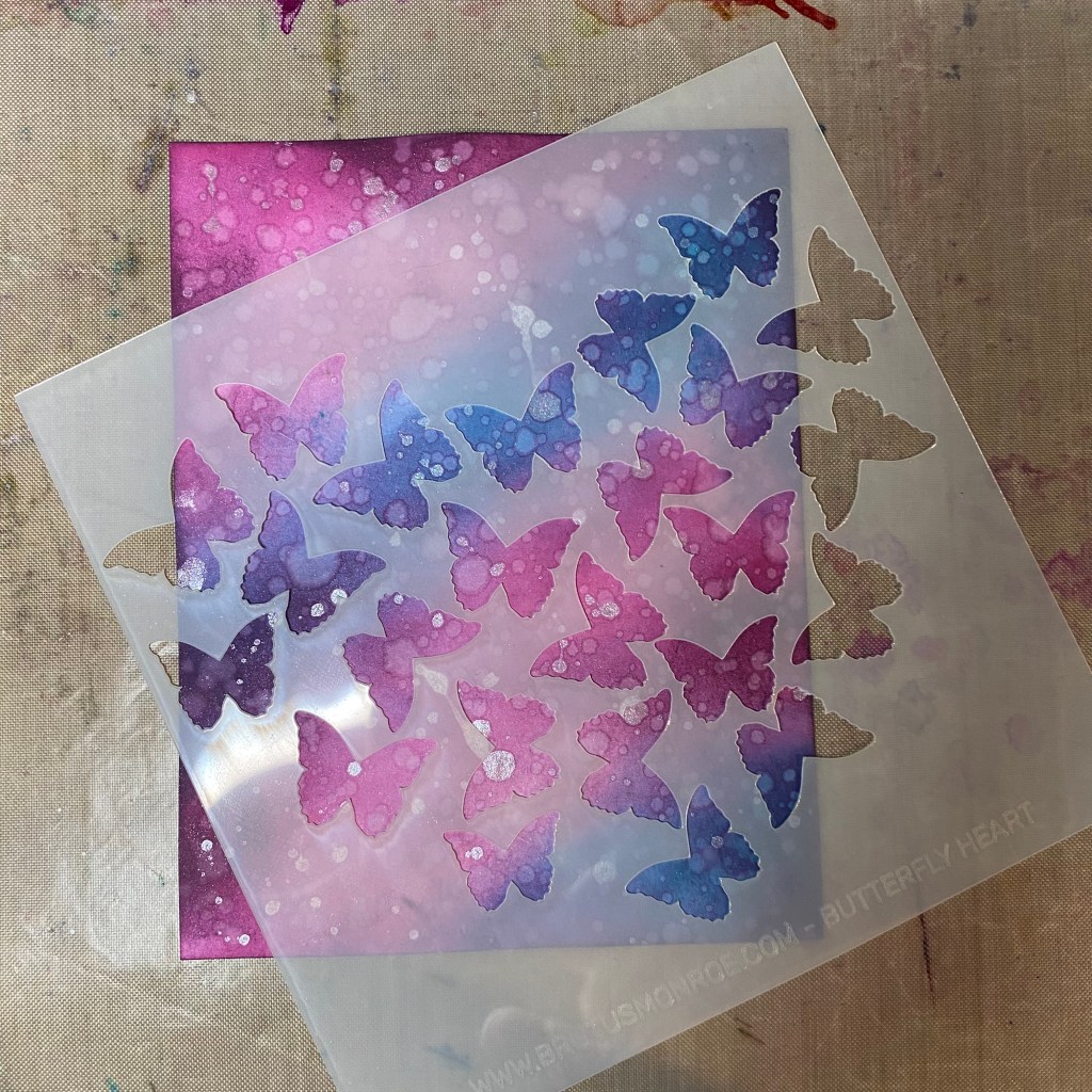 I chose my color palette based on some of my favorite colors. I wanted to combine inky and grungy with a contrast of class and elegance. Just like me. LOL! I started blending my background on my favorite blending paper. I used pinks and turquoise then finished off with a shade of my favorite color, purple. This grungy panel needed some shimmer so I splattered it with Shimmer Mist. Next I had to add the elegance to it. So I chose the Butterfly Heart stencil. To contrast the elegant and delicate butterflies, I used Purple Galaxy Glaze.