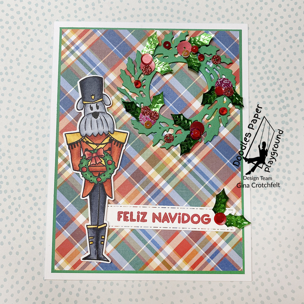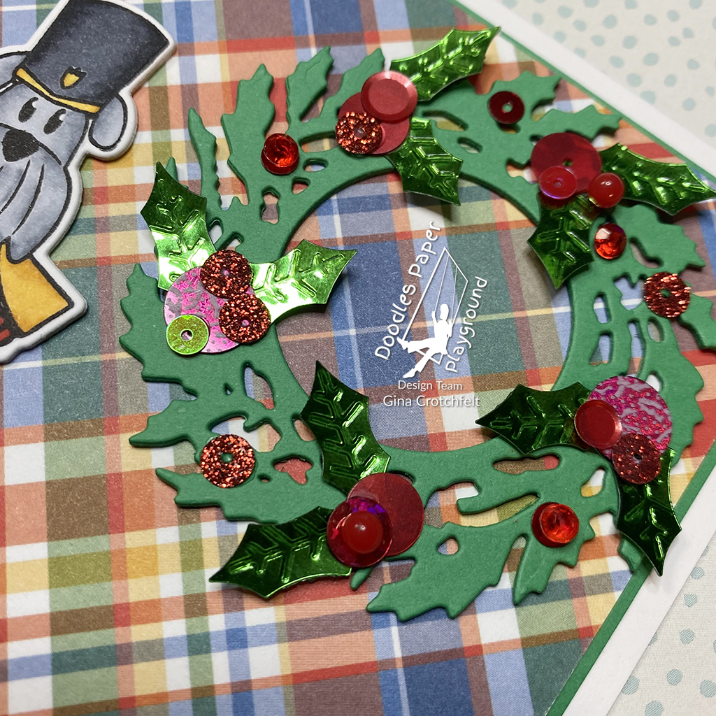 The wreathe die is from Tim Holtz’s “Wreath & Die” Thinlets by Sizzix. The banner is from Kindred Stamps. The dog stamp, die and plaid paper are from one of my favorite Collections by Photoplay titled “Muttcracker.