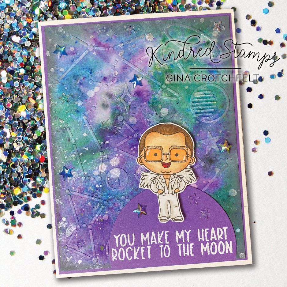Next I created these glittery piano keys for our fine feathered friend to dance on. He is colored with Copics. The sentiment is heat embossed in gold. I decorated it with adhesive rhinestones and glued down some stars to make this guy shine. Lastly, is this I wanted to find a way to rocket to the moon so I created this background to look like outer space. I used a colors burst powders and a cosmic embossing folder. This rocket man is colored with Copics. The sentiment is heat embossed with white glitter. I added some stars to the background and Stickles on his glasses.