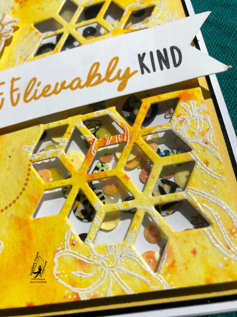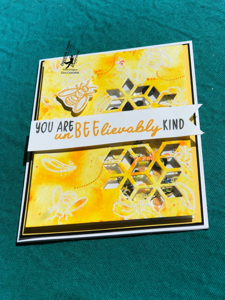 Something else that reminds me of summer is bees. And since I could not resist the adorable Bee Creative blend, I had to find a way to use them. I used a variety of yellow and orange color burst powders for this background, after I stamped the bee & flower images and embossed with white embossing powder on watercolor paper. I used Sauna ink from Catherine Pooler for the yellow sentiment. Stamps, dies and paper are from Stampin’ Up.