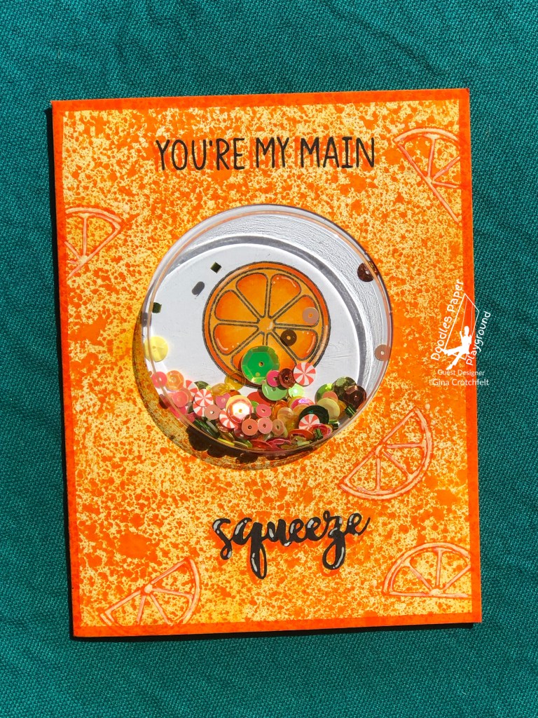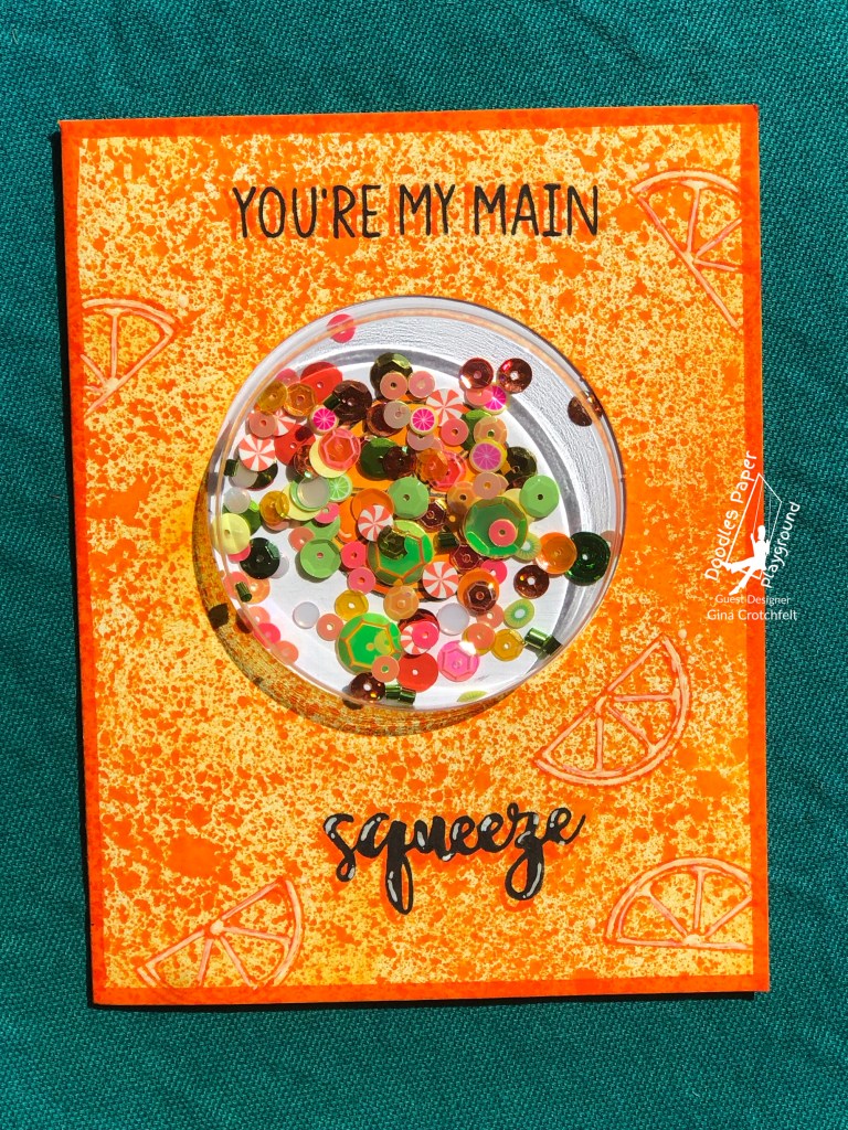 This is what I call a “cheater shaker.” It’s the first time I used one of these pre-made shaker cards and I did not love it. The biggest reason being the shaker is way too deep if you plan on mailing the card. However, it would be great for some of the Sparkle Blends that have bigger elements. Secondly, the adhesive on the plastic shaker part is on the wrong side so I had to glue it. Doesn’t make sense. But I still had fun with this delicious card, especially making the background. I used Spiced Marmalade Distress Spray for the first time and it was so much fun! I will definitely be playing with sprays more in the near future. I filled in the sprayed background with Sauna ink from Catherine Pooler. I used the “Fresh Squeezed” stamp set from Kindred. The orange in the shaker was colored with Copics and the slices on the background were stamped in Orange Twist ink from Catherine Pooler. I also used Orange Twist to stamp a shadow for the sentiments before I stamped them in black. I added some highlights with a white pen. I filled the shaker with Citrus Tornado Sparkle Blends from Doodles Paper Playground.