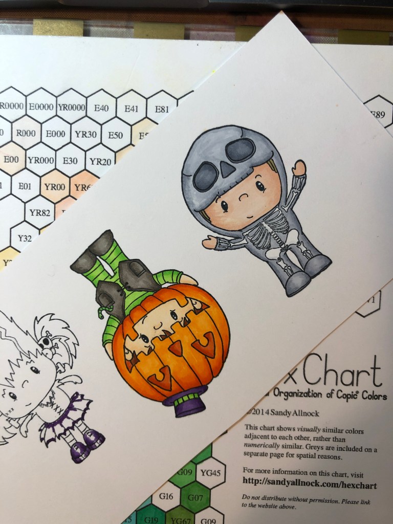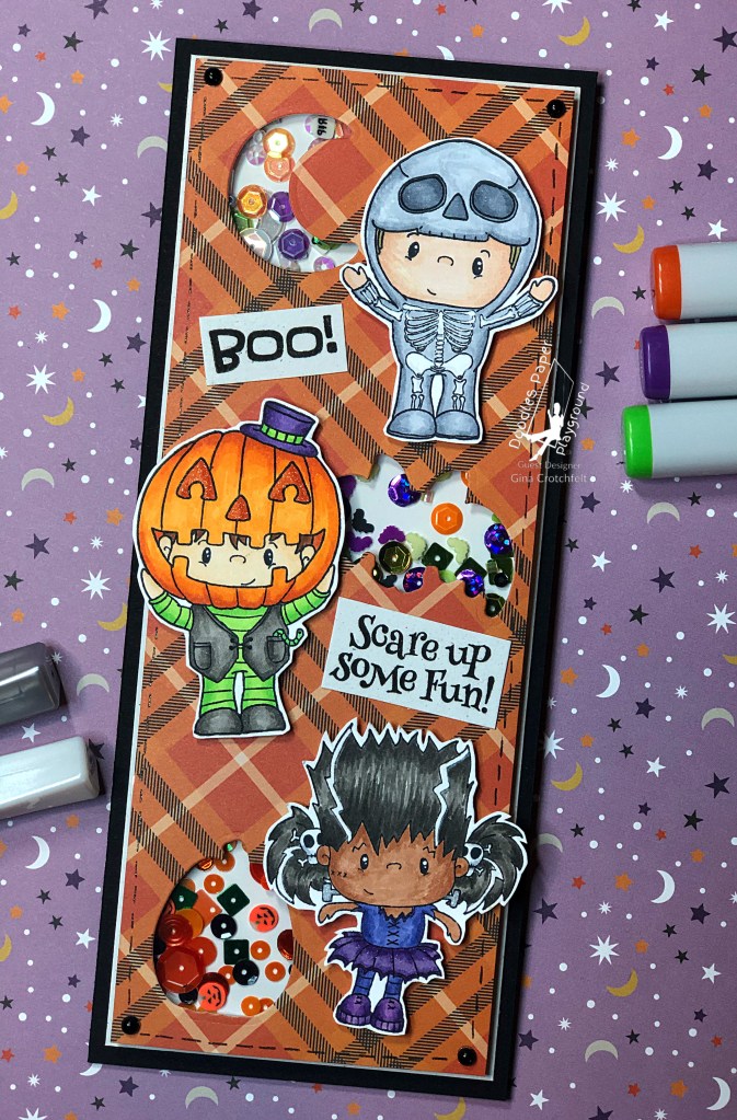 The next night I was prepared to create a spooky background for these cuties using Doodles Paper Playground’s September mood board. I watched a really cool technique on YouTube that I couldn’t wait to try. Unfortunately (although fortunately) the technique worked so good, it was just too spooky. I also realized that all three of these kids would be squished on an A2 card size, so I had to come up with a new plan. I knew eventually I was going to have to cave to the slimline card trend and these cuties were definitely worth it.