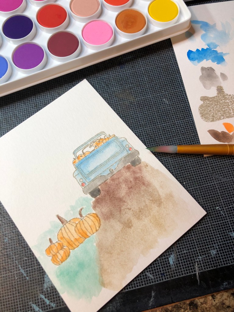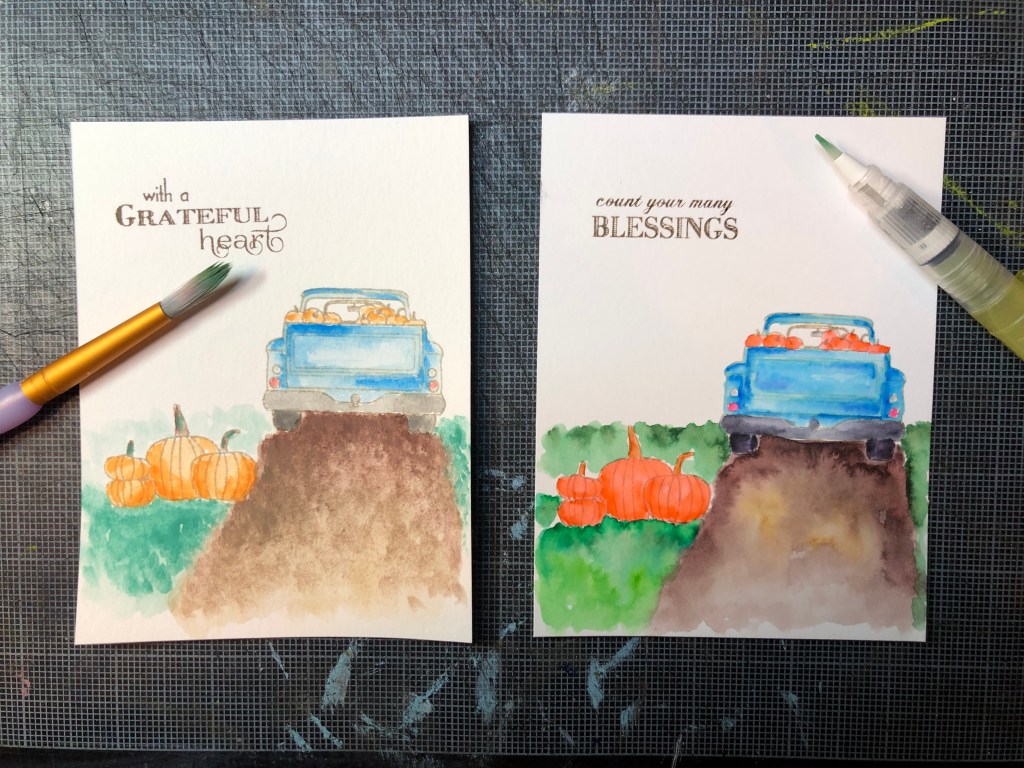 I decided to be fair, I would stamp the same image for each example. I used the Fall Farmhouse stamp set from Simple Stories. To keep the full watercolor effect, I stamped with with a very pale beige color to get the “no line” effect.
