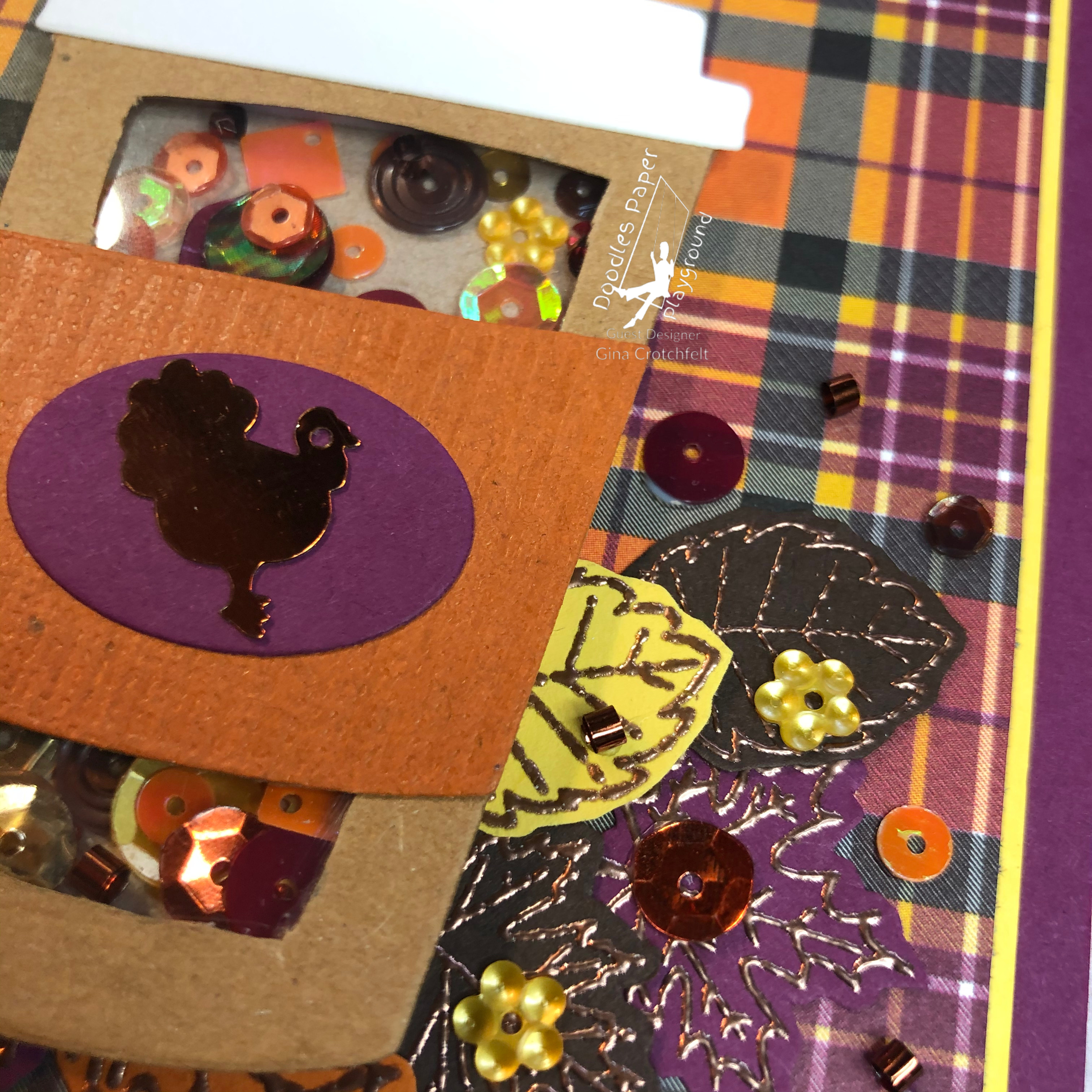 Take a look at the window and notice the beautiful colors in this shaker blend from Doodles Paper Playground called “Give Thanks.” They make a perfect backdrop for the turkey. I know most people don’t send Thanksgiving cards, but I can’t think of a better time to let someone know how grateful you are to have them in your life. So take the time to make stuff and be happy.