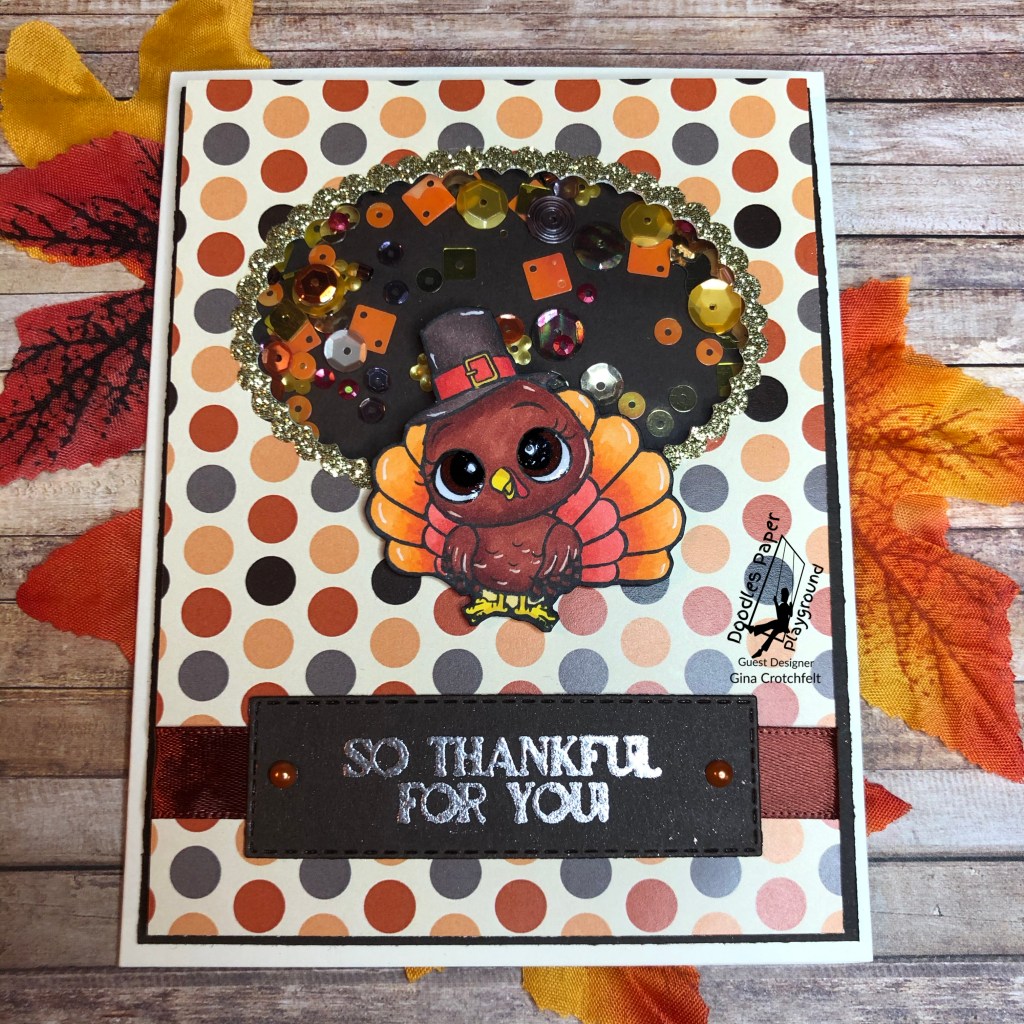 Take a look at the window and notice the beautiful colors in this shaker blend from Doodles Paper Playground called “Give Thanks.” They make a perfect backdrop for the turkey. I know most people don’t send Thanksgiving cards, but I can’t think of a better time to let someone know how grateful you are to have them in your life. So take the time to make stuff and be happy.