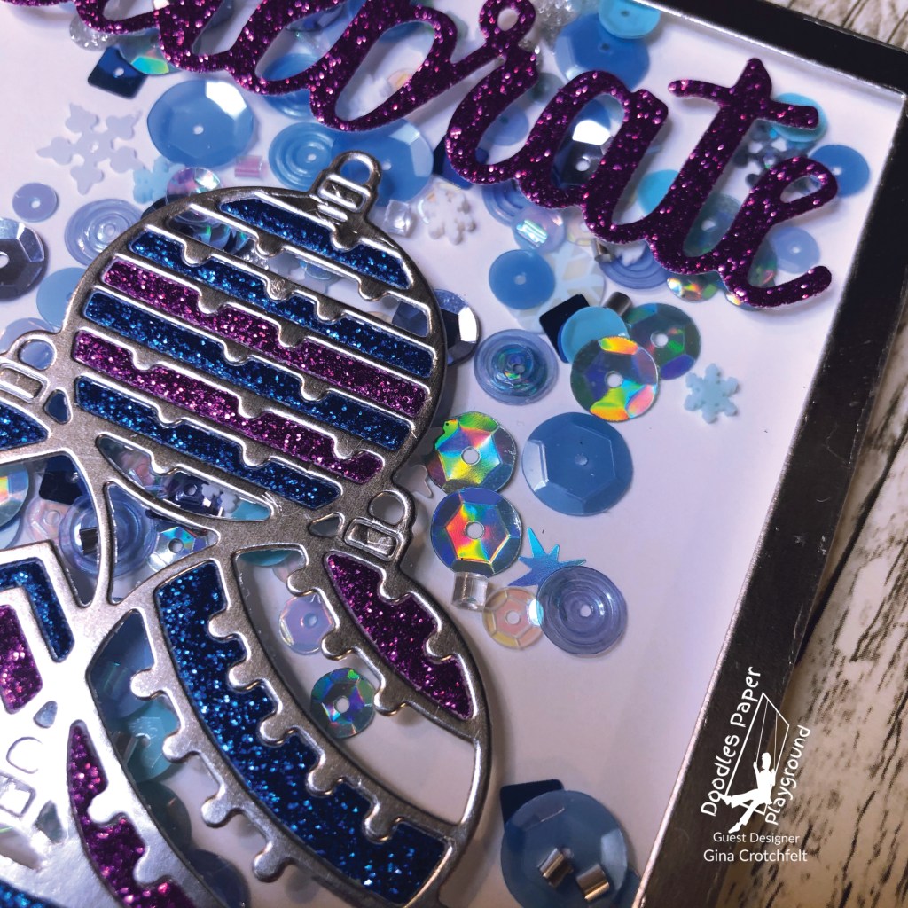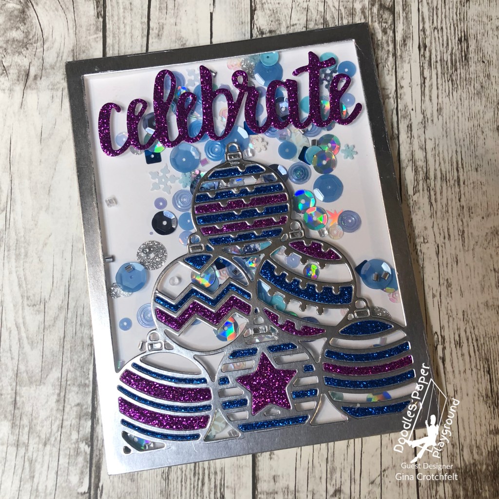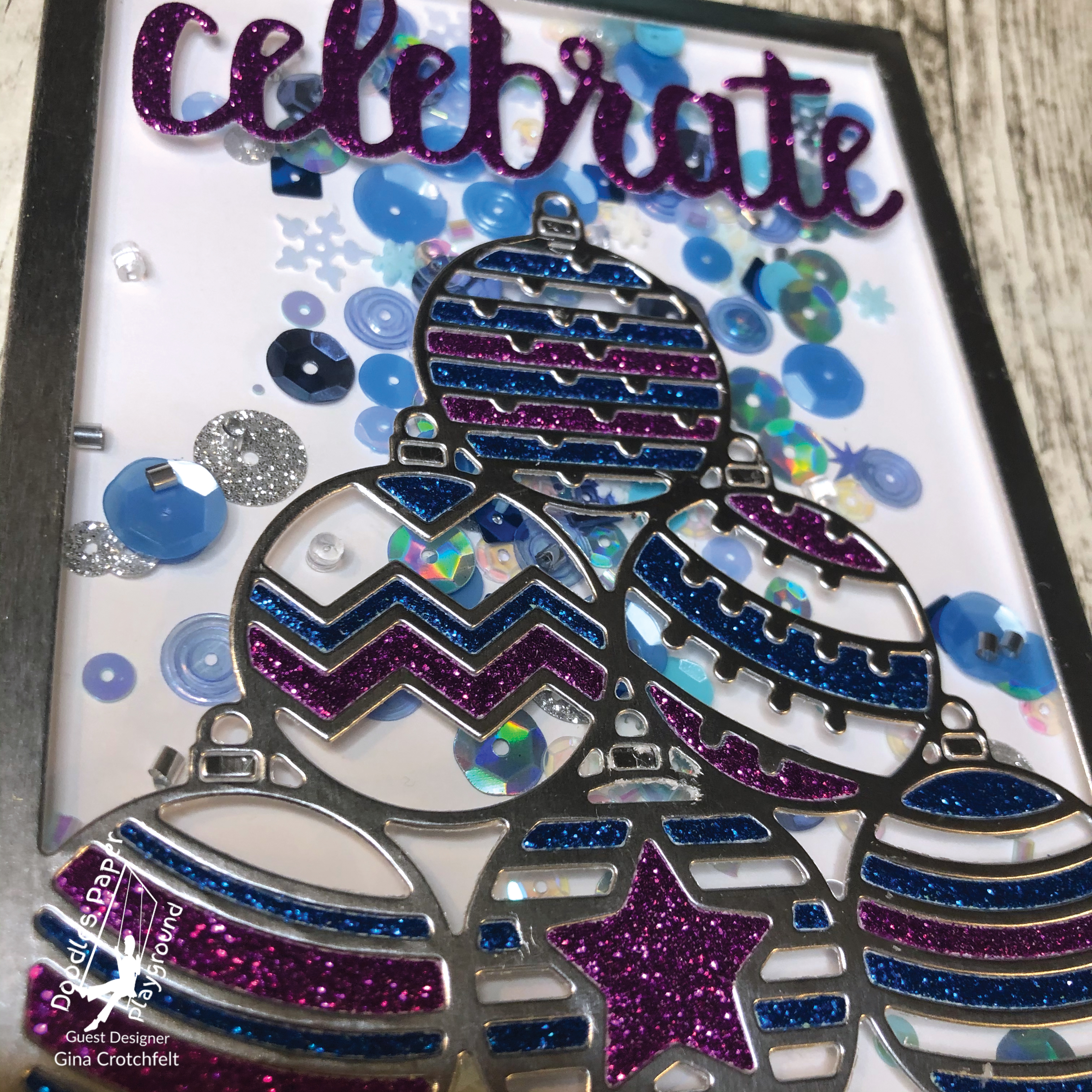 This card came together so easily. Aside from the intricate pieces, this was a simple fun card. I used an A-2 card sized dies from Brutus Monroe called “Ornaments Die.” I ran it through with 3 different specialty papers (silver foil from Stampin’ Up and Pink & blue glitter cardstock from Brutus Monroe. I created my window with the silver piece then played around mixing and matching the other pieces til I found something I liked. I created a quick and easy shaker window and filled it with “Blue Blizzard” Sparkle Blends from Doodles Paper Playground. I added the “Celebrate” sentiment using a Stampin’ Up die and I had a complete card to die for.