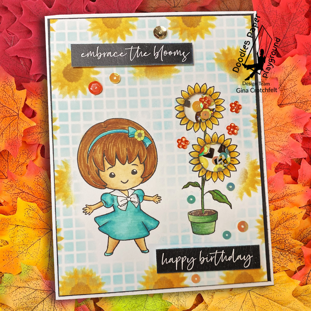 I wanted to convey something radiant. And since I am in love with this Layering Sunflower stencil from Photoplay, I thought it was the perfect match for the “Sunflower” Sparkle Blends from Doodles Paper Playground. This blend is filled with warm golden tones but has brown shimmer pieces that really make it glow. The clay slices give it a very organic feel and the small discs really balance out the colors. I loved that I was able to use the different elements on the outside of the card to accentuate different parts of my stamped image. This adorable girl and flower pot are part of “Bloom Stamp” from Sassy and Crafty. They have a very diverse, amazing selection of stamps. I used an Echo Park stencil to lightly make a background pattern with the new Salvaged Patina Distress Oxide Ink. The girl and flower were colored with Copics. The sentiment strips are Brutus Monroe’s Conversation Clippings.