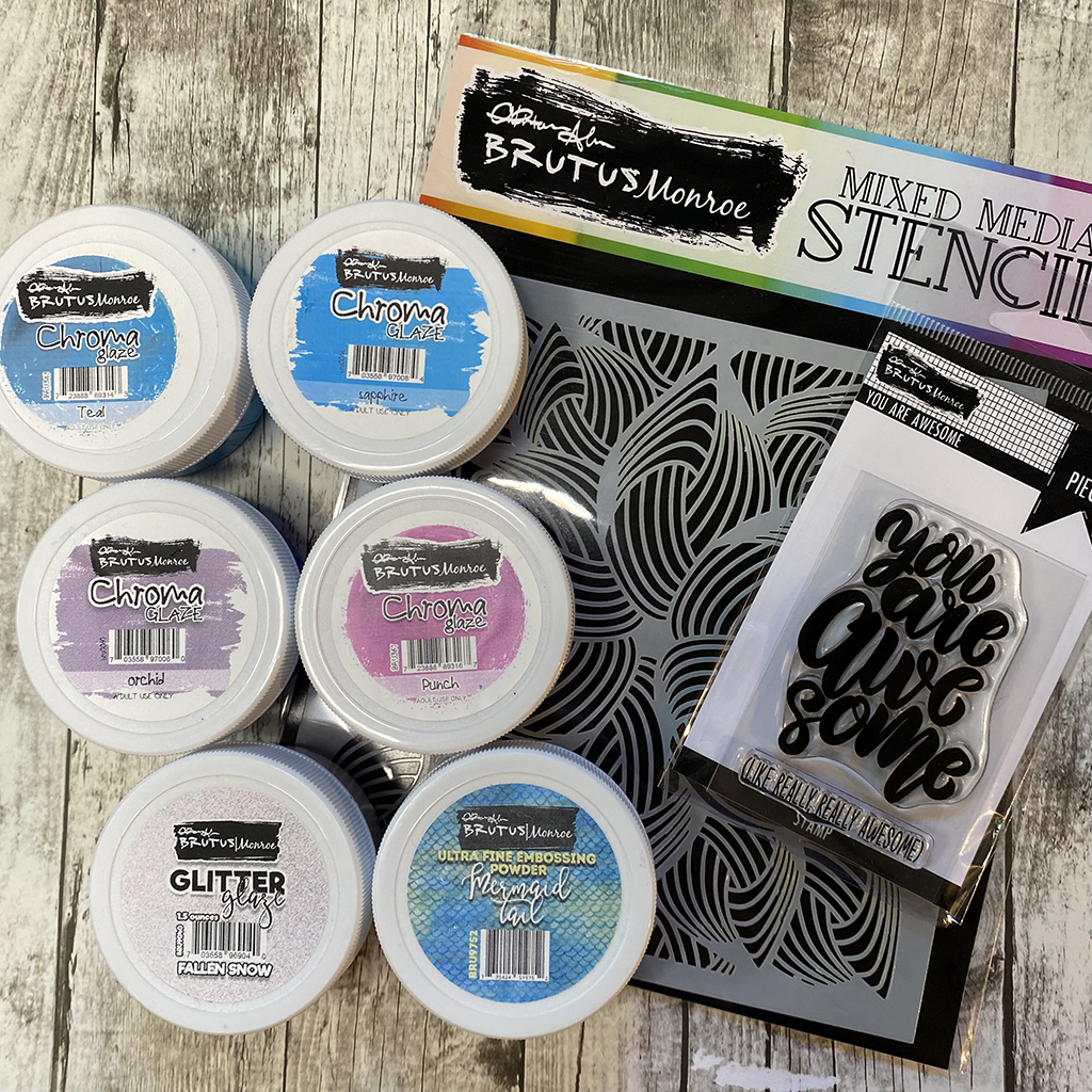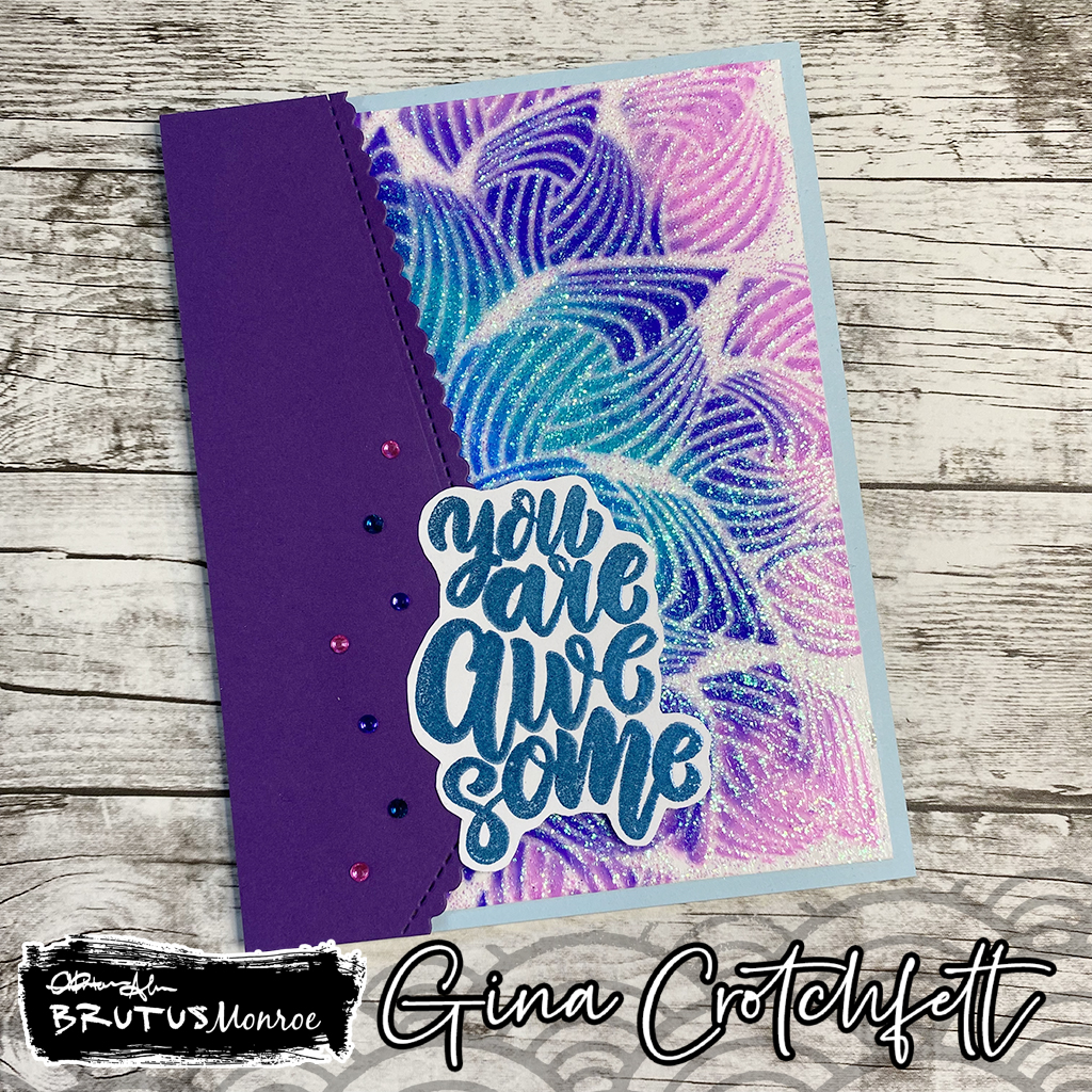 The rest of the card came together pretty simply. I stamped the “You Are Awesome” stamp in embossing ink and heat embossed it with Mermaid Tail embossing powder. I fussy cut and popped it with adhesive dots. Once I put the card together, the final touch was some rhinestones to balance out the plain side of the card with the stenciled background. If you’d like to check out more amazing stencils from Brutus Monroe go here. And here you can find all the different colors and finishes of Brutus Monroe Glazes.