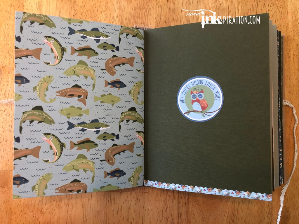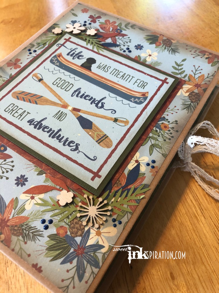 Below is my first twine binding mini album made for my friend Tammy. She is a hunter, fisherman (fisherwoman?), loves the outdoors and is truly one of my favorite people on the planet. So Photoplay’s Lakeside by Becky Fleck was perfect for her book. I did have to fill in with a few sheets of cardstock and miscellaneous pattern paper. I used a few sheets of Chatterbox paper. Chatterbox was one of the first companies I fell in love with some 20 years ago when I first started scrapbooking. Yes, I still have paper from 20 years but I used it – so no judgement! The wood embellishments, leaf die cuts, twine, pinecone charms, lace trim and epoxy shapes on the inside pages are all from Stampin’ Up. The blue enamel dots on the cover were made with Nuvo’s Midnight Blue Crystal Drops. I also used Mahogany Powederpuff ink from Quick Quotes with Life Changing Blender brushes from Picket Fence Studio to ink the edges.