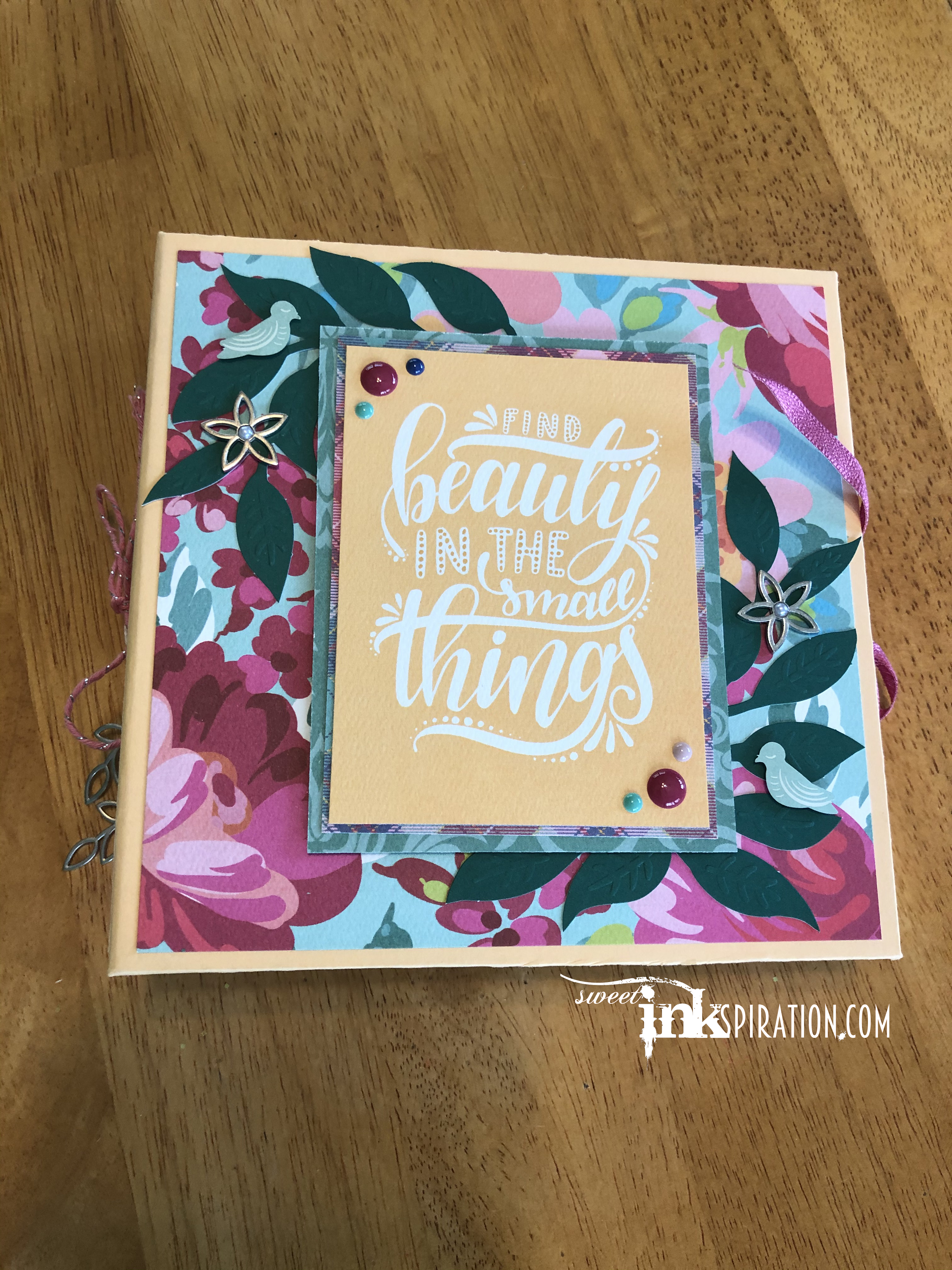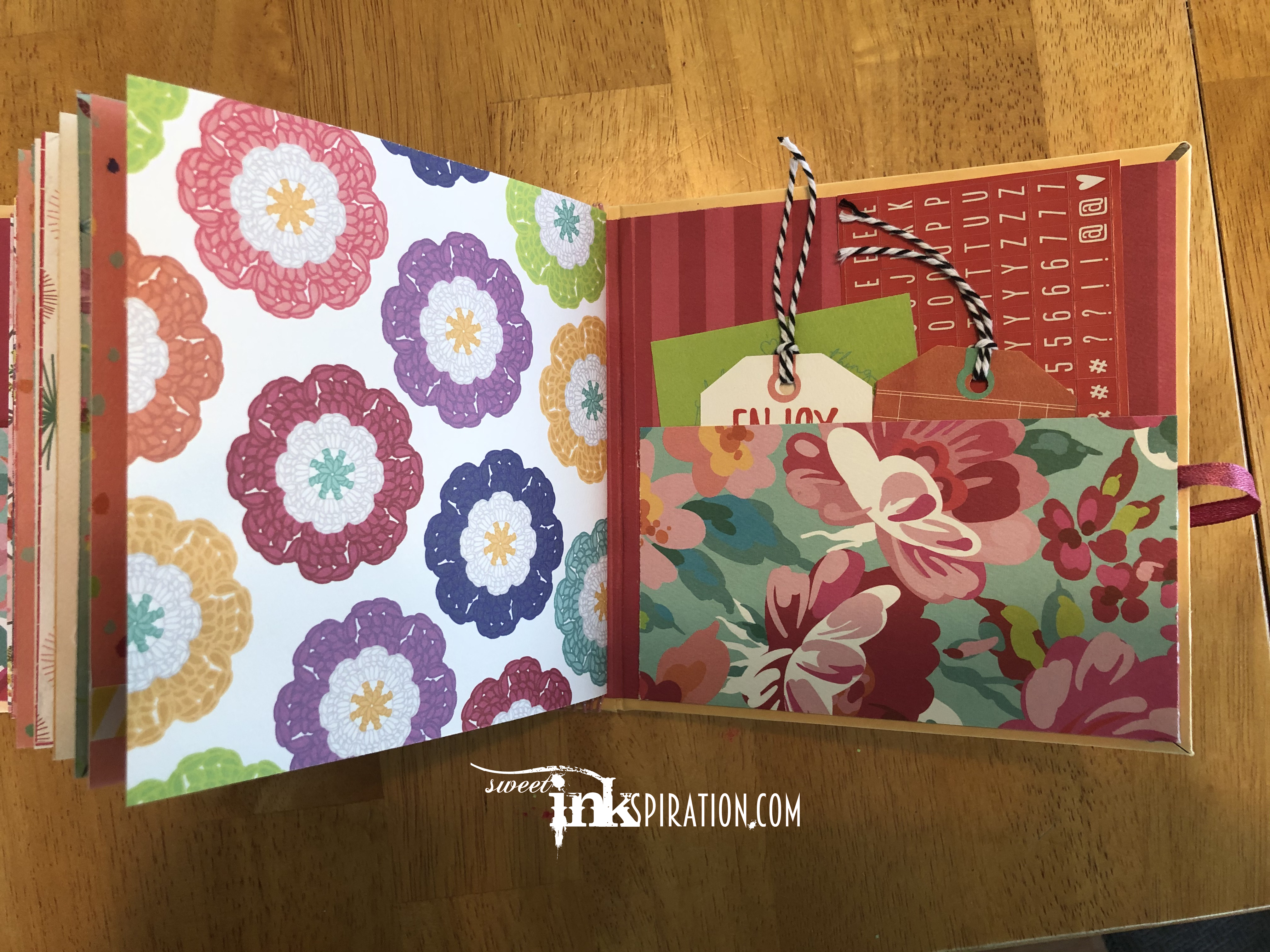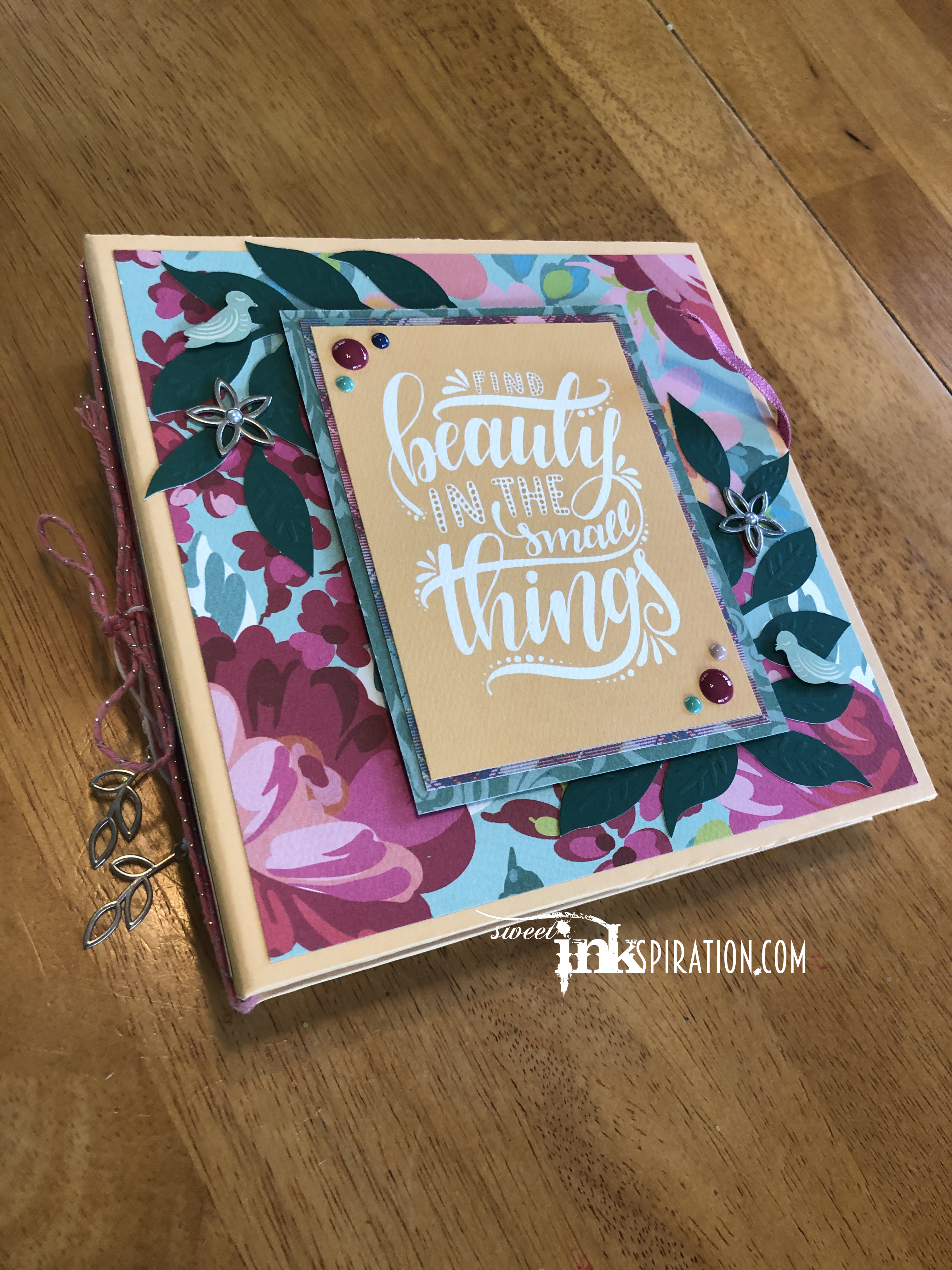 Aside from crafting, one of Dee’s biggest hobbies is gardening. So, flowers were a no brainer for the book. I used the “Celebrate the Little Things” collection pack by Becki Adams. This is a very unique set with a bright, beautiful color pallet. If you can’t already tell, I am obsessed with color and color combinations. I love anything unique and unsuspected. Which is basically the opposite of my own style of designing in my professional career. I tend to have a cleaner, sleeker, more organized style of design. Some may say OCD. But once again, I don’t know who. The rest of the embellishments, ribbon and twine were from Stampin’ Up, except the epoxy shapes and the stickers and tags on the inside pages which came with the collection pack.