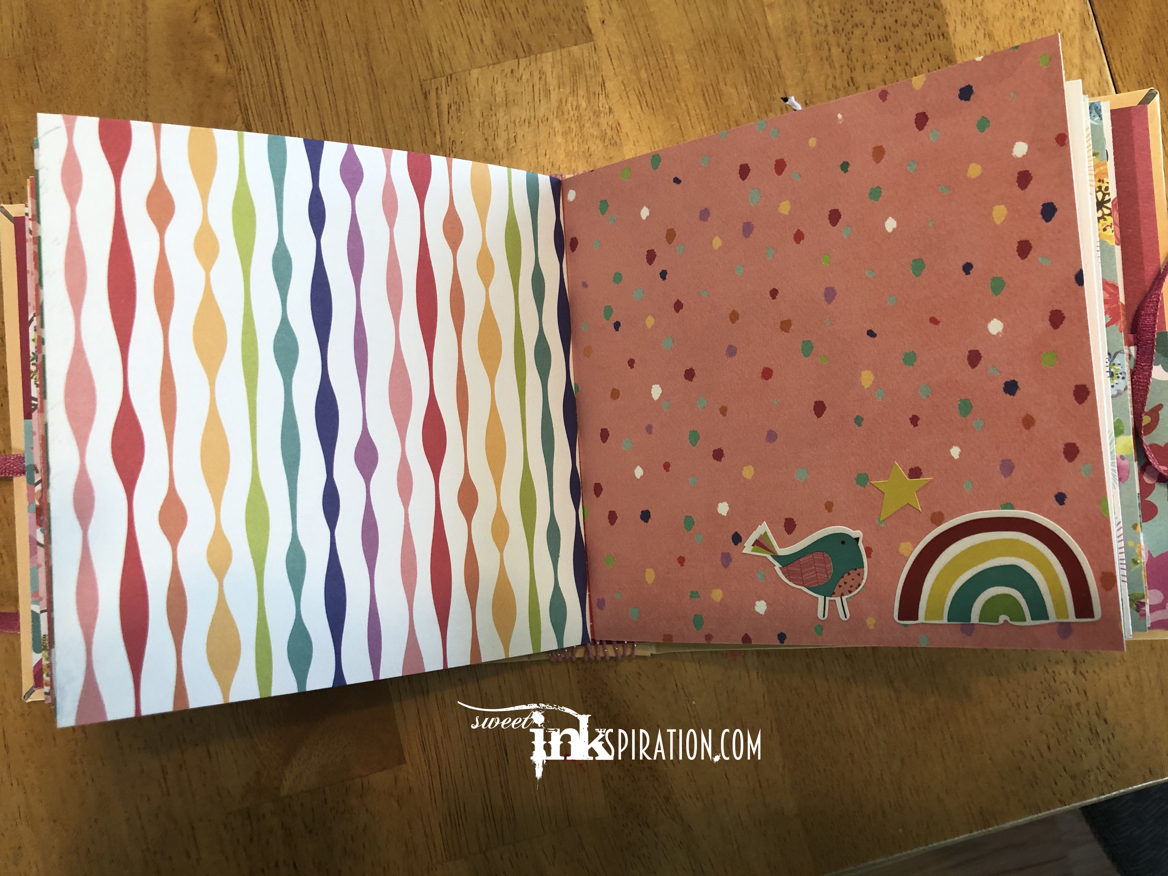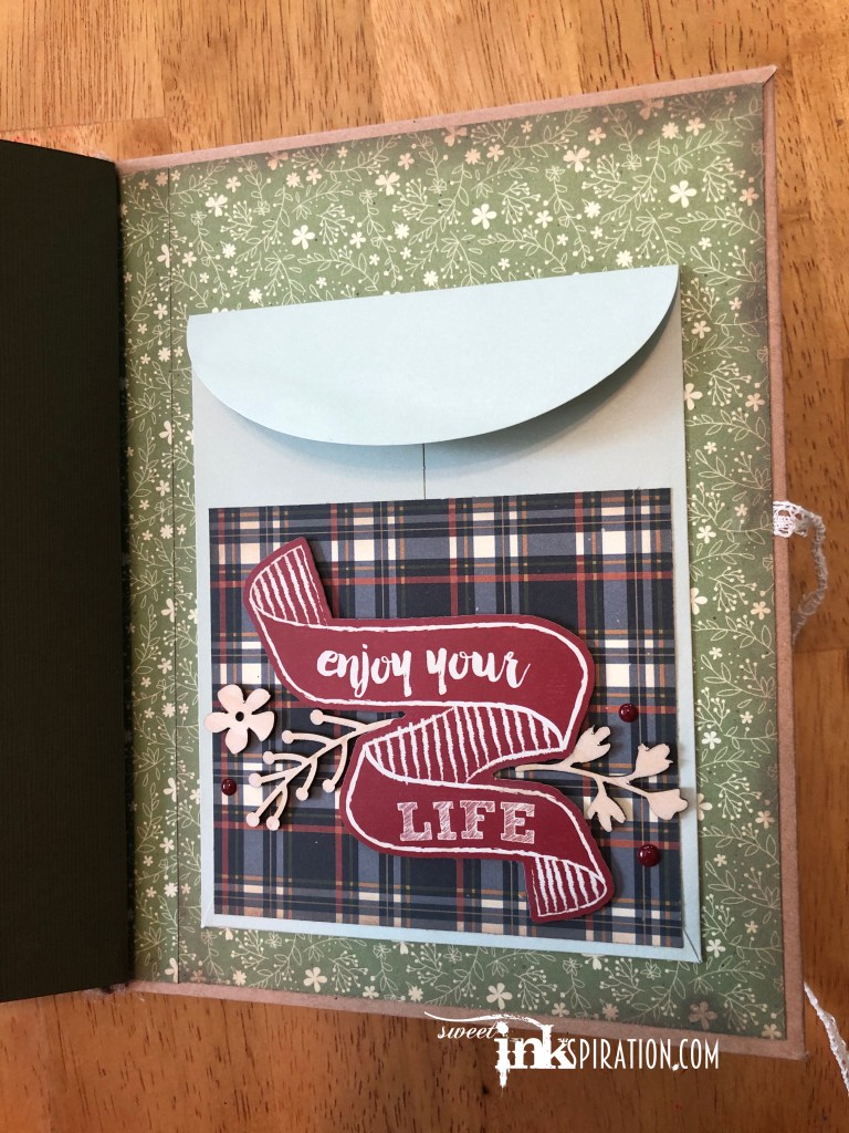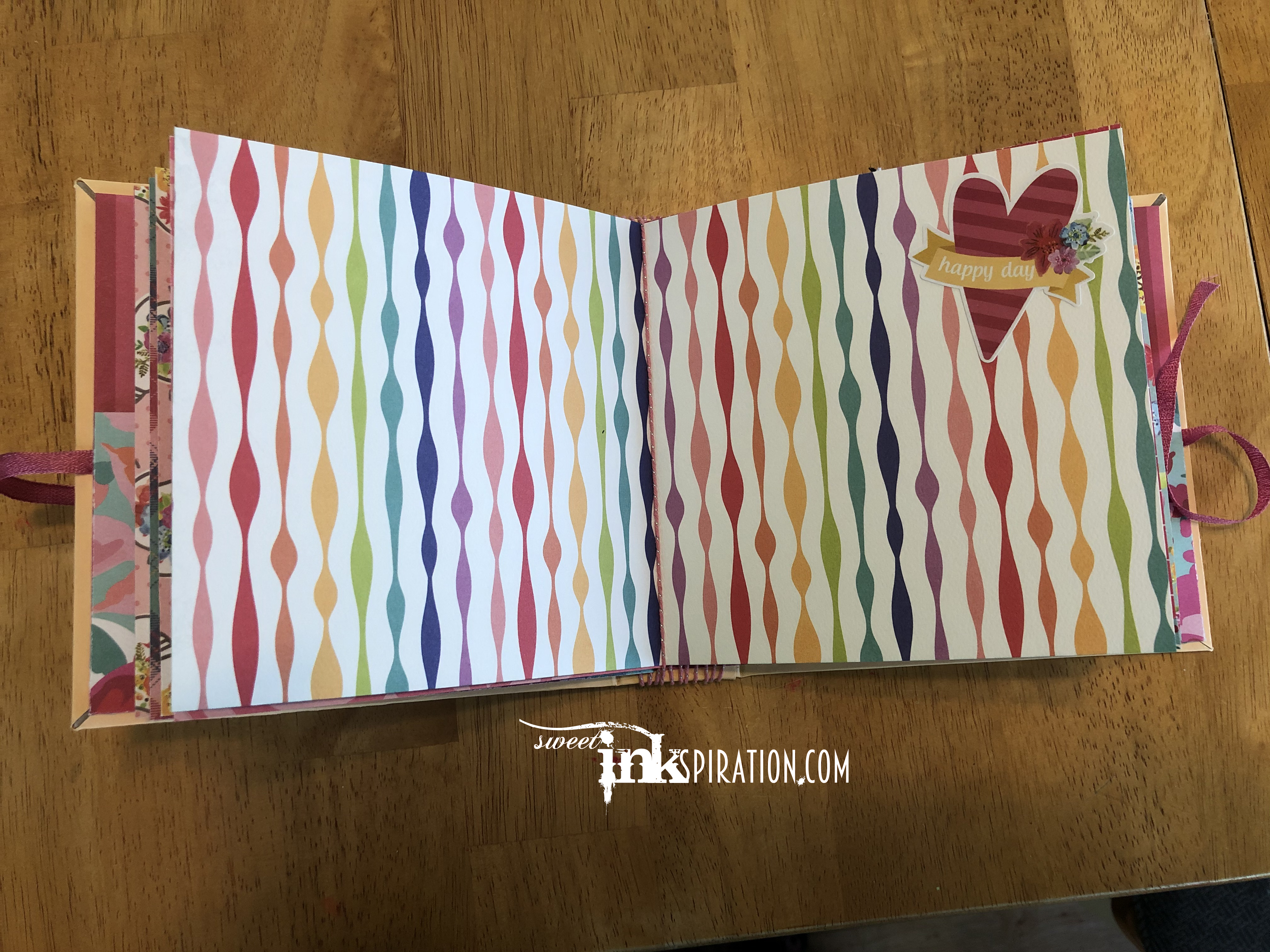 Aside from crafting, one of Dee’s biggest hobbies is gardening. So, flowers were a no brainer for the book. I used the “Celebrate the Little Things” collection pack by Becki Adams. This is a very unique set with a bright, beautiful color pallet. If you can’t already tell, I am obsessed with color and color combinations. I love anything unique and unsuspected. Which is basically the opposite of my own style of designing in my professional career. I tend to have a cleaner, sleeker, more organized style of design. Some may say OCD. But once again, I don’t know who. The rest of the embellishments, ribbon and twine were from Stampin’ Up, except the epoxy shapes and the stickers and tags on the inside pages which came with the collection pack.